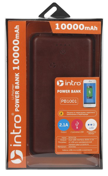 Power Bank Intro PB1001 имеет стильный корпус из коричневой кожи, который придает ему элегантный и привлекательный внешний вид. Он также легко помещается в сумку или карман, что делает его удобным для переноски повсюду.