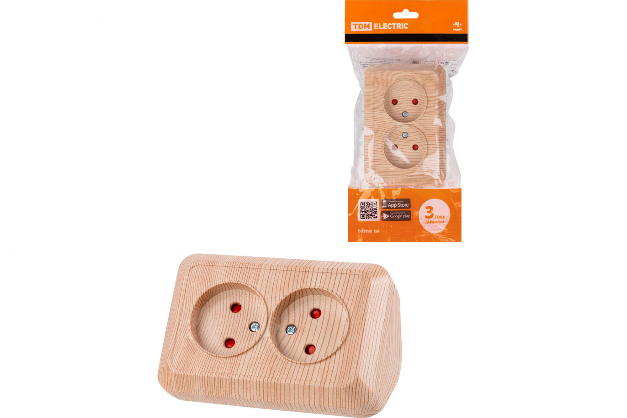 Угловая двойная розетка открытой установки с заземлением и защитными шторками IP20. Разработана для использования в бытовых и офисных помещениях. Имеет два отверстия для вилок, позволяющие подключить два электрических устройства одновременно. Рабочее напряжение 250В, максимальный ток 10А. Изготовлена из прочного материала - сосны. Продукция от производителя TDM из серии Ладога отличается высоким качеством и надежностью.