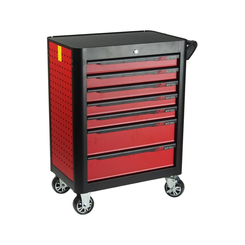 Тележка инструментальная (7 секций, красная, на колесах) JTC S1068 обладает значительным объемом. Наличие нескольких ящиков позволяет систематизировать хранение инструмента. Поворотные колеса существенно облегчают перемещение тележки даже при полной загрузке. В верхней части имеется удобная рукоятка. Боковой карман функционален: можно хранить небольшой инструмент или мелочь в процессе работ. Верхняя полка покрыта защитным материалом.