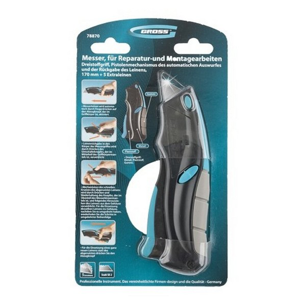 Нож ремонтно-монтажный трехкомпонентный с рукояткой автоматического выброса и возврата лезвия типа пистолет. Длина лезвия 170 мм. В комплекте 5 запасных лезвий. Производитель - GROSS.Этот нож идеально подходит для профессионального использования в ремонтных и монтажных работах. Удобная рукоятка обеспечивает комфортное использование, а автоматический механизм выброса и возврата лезвия делает процесс замены лезвия быстрым и удобным. Благодаря своей надежности и функциональности, этот нож станет незаменимым инструментом в вашем инструментарии.