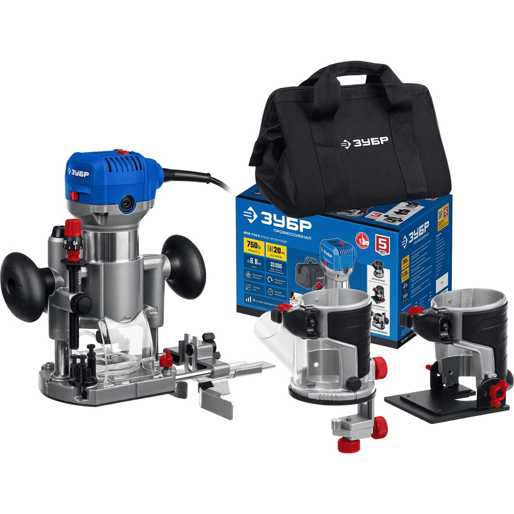 Фрезер кромочный 750 вт, в наборе - 3 основания, сумка, ЗУБР Профессионал ФПК-750Н применяется для фрезерования (в т.ч. фигурного, по шаблону, по радиусу) заготовок из дерева, древесно-стружечных плит, пластмасс и металла (при установке соответствующих фрез). Фрезер кромочный ЗУБР – компактное изделие для удобства обработки кромок. Достаточная мощность, два размера цанг для использования разных типов фрез. Электронные системы позволяют использовать изделие с полной отдачей и быть уверенным в своей безопасности. Удобство хранения и переноски благодаря сумке в комплекте.
