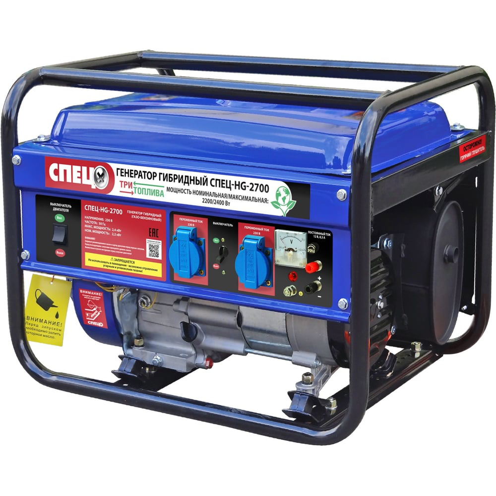 Гибридный генератор газ-бензин СПЕЦ-HG-2700и комплект для подключения к сети+баллону предназначается для снабжения бытовых приборов или инструментов электричеством на даче, в домашней мастерской. Все элементы устройства крепятся на жесткую металлическую раму, которая образует две ручки для удобства перемещения по площадке. Предусматривается масляный щуп, с помощью которого пользователь имеет возможность контролировать уровень смазочной смеси в картере. Система электронного зажигания не требует регулирования. Модель вырабатывает стабильный ток 220В 50Гц. Двигатель отличается долговечностью эксплуатации. Уровень масла легко и просто контролируется при помощи встроенного датчика, что успешно препятствует преждевременному износу внутренних элементов. Русскоязычная панель управления облегчает использование устройства. Металлическая рама снижает риск негативного механического воздействия на агрегат. В качестве топлива используется не только бензин АИ-92 и сжиженный газ в баллонах (пропан-бутан), но и магистральный газ (метан). Наличие клемм 12 В дает возможность подзарядки аккумуляторной батареи. Бак стальной.