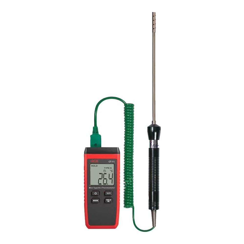 В базовом исполнении одноканальный контактный термометр RGK CT-11 с зондом температуры воздуха TR-10A с поверкой измеряет температуру в диапазоне от - 40°С до + 260°С с погрешностью не более ± 1,5 °C. Контактный способ работы позволяет точно определить температуру поверхности, жидкости или газа. Благодаря обширным измерительным возможностям и точности прибор может использоваться как для бытовых, так и для профессиональных измерения при работе с промышленным оборудованием, распределительными щитами, системами отопления, электродвигателями и др. Полезные функции Специальная индикация оповещает специалиста о ненадлежащем подключении или неисправности термопары. Цифровой контактный термометр RGK CT-11 с зондом температуры воздуха TR-10A также сообщает о превышении предела измерения. Измерение пиковой и средней температуры упрощает реализацию различных сценариев проверки, особенно при работе с крупными объектами. Эргономика и надежность За счет небольшого веса компактный прибор удобен для проведения длительных инспекций в полевых условиях, легко помещается в карман одежды или сумки. Прочный корпус снабжен рельефными участками для надежного захвата и устойчив к падениям с метровой высоты. Варианты модернизации При подключении более продвинутых моделей выносных датчиков рабочий диапазон контактного термометра RGK CT-11 с зондом температуры воздуха TR-10A расширяется до - 50 °С — + 1300 °С.