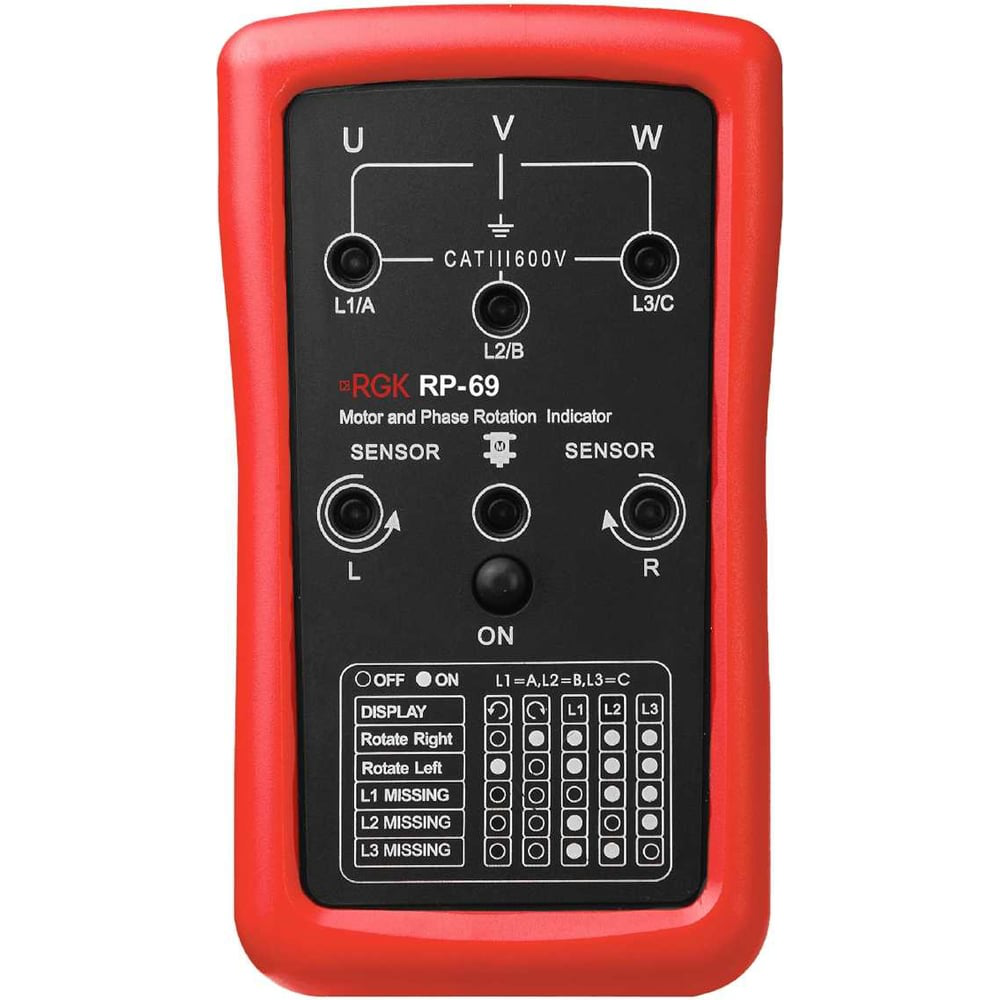 азоуказатель RGK RP-69 - это надежный прибор в ударопрочном корпусе, который в первую очередь ориентирован на специалистов-электротехников, выполняющих обслуживание сетей и установок. Эта модель позволяет быстро провести диагностику трехфазной электросистемы или оборудования, например, электродвигателя. Пользователю доступны следующие функции: определение порядка чередования фаз; индикация направления вращения двигателя; сигнализация о повреждении или неисправности проводника; проверка наличия магнитного поля. Бесконтактный режим. Тестирование электродвигателей производится в беспроводном режиме - достаточно просто поместить прибор на корпус установки, параллельно валу, и посмотреть на сигналы индикаторов. Индикатор чередования фаз RGK RP-69 совместим как с трехфазными, так и с однофазными двигателями за исключением моделей с частотно-регулируемым управлением. Безопасность. Указатель чередования фаз RGK RP-69 относится к третьей категории электробезопасности и протестирован по стандарту CAT III 600 В. Это гарантирует возможность работы с промышленными трехфазными сетями, коммутационным оборудованием, различными электроустановками и др. Все необходимое в комплекте. Устройство готово к работе прямо из коробки т. к. в комплект поставки входят тестовые провода, зажимы типа “крокодил” для подключения к сетям или оборудованию, а также подходящий элемент питания. Также предусмотрен чехол для безопасного хранения и транспортировки указателя последовательности фаз RGK RP-69.
