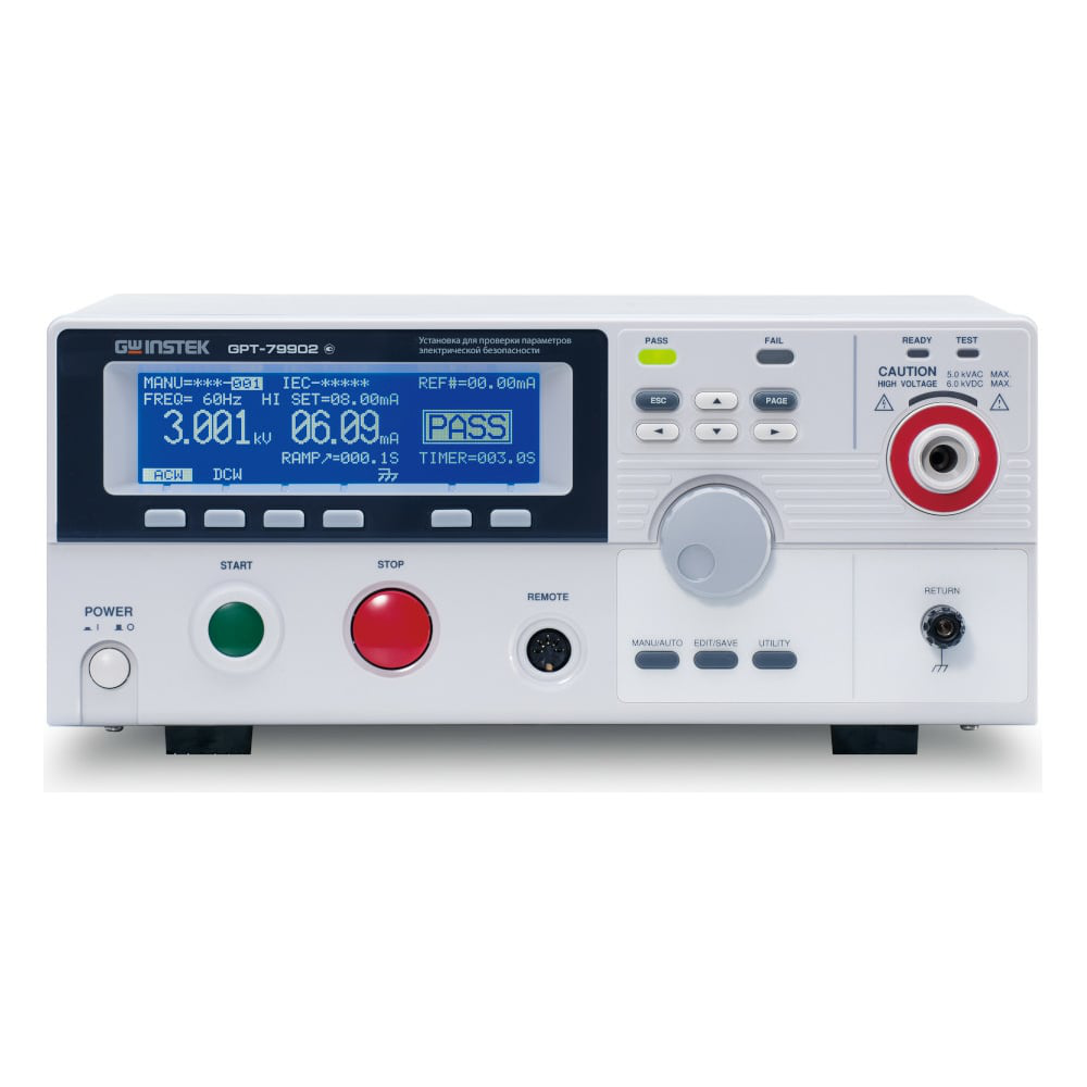 Установка для проверки параметров электрической безопасности GW Instek GPT-79902 – это многофункциональная (AC/DC) пробойная установка с выходной мощностью 500 ВА. Функции: тест на пробой переменным напряжением (100 В…5,0 кВ с разрешением 2 В), тест на пробой пост. напряжением (100 В…6 кВ с разрешением 2 В), диапазон установки переменного/ постоянного тока 0,001…100 мА/ 20 мА (разреш. 1 мкА). Графическое отображение результатов тестирования четко транслируется на ЖК-дисплее 240×64. Имеется высокий уровень безопасности и защиты: режимы «Самопроверка»/«Отсечка» (Uвых отключается за 150 мкс)/авторазряд выхода установки (~200 мс)/«Zero Crossing» (форм.