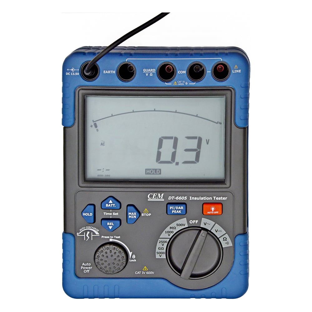 Мегаомметр СЕМ DT-6605 481653 представляет собой портативный прибор для измерения сопротивления изоляции высоковольтных линий. 4 диапазона напряжения (500В, 1000В, 2500В, 5000В) позволяют настраивать микрокомпьютер на работу с конкретным объектом. В режиме прозвонки цепи предусматривается наличие звукового сигнала. Для комфорта в работе есть возможность выбирать уровень подсветки экрана.