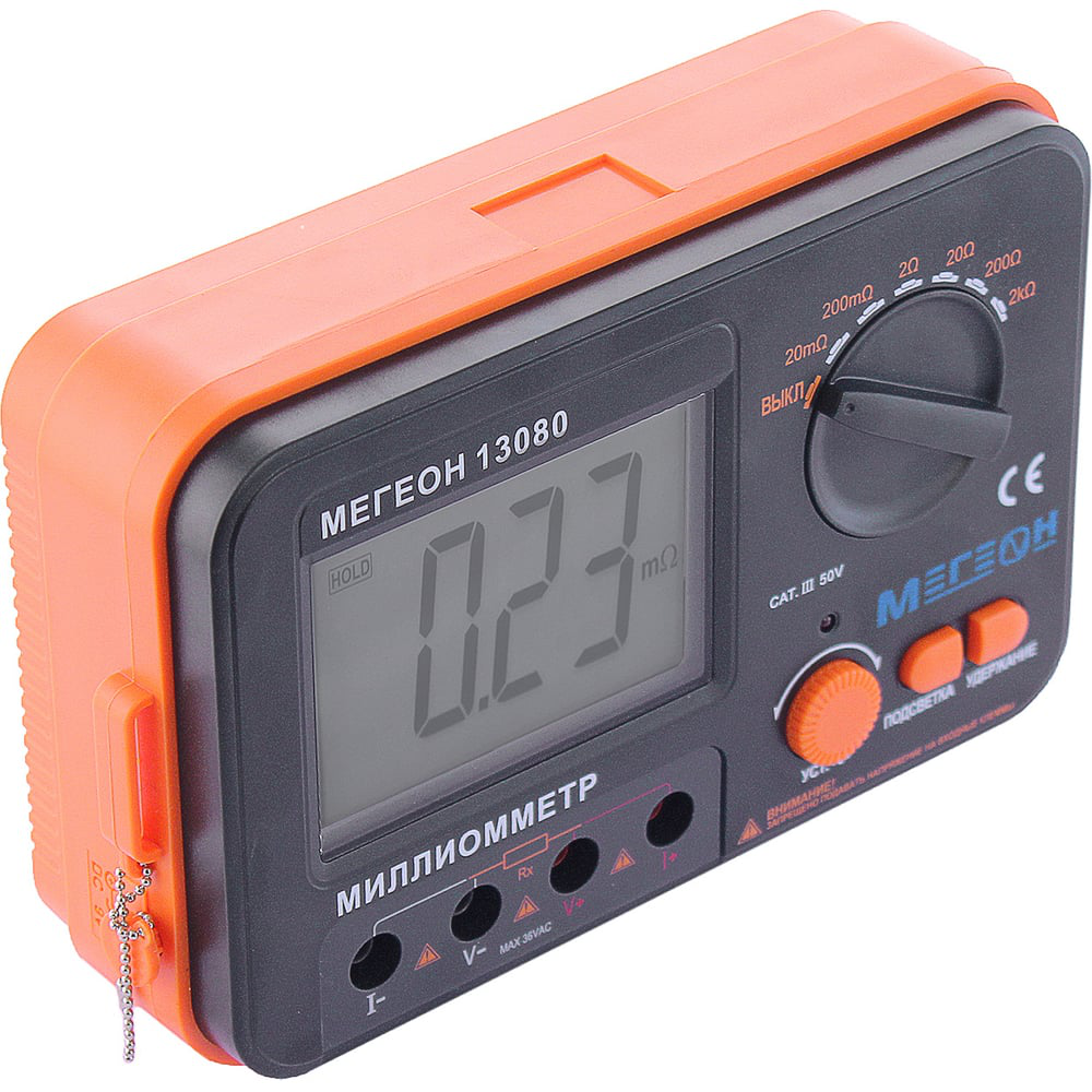 Компактный милиомметр МЕГЕОН 13080 от компании МЕГЕОН представляет собой высокоточный измерительный инструмент с богатым набором дополнительных функций. Благодаря специальному разъему, Вы можете подключить данный омметр к источнику постоянного питания. Это позволит использовать четырех проводной метод измерения сопротивления (цифровой мост), который в свою очередь обеспечит высокие показатели точности. МЕГЕОН 13080 дает возможность измерять сопротивление нагревательных элементов, различных проводников, а также сопротивление в местах пайки. Прибором очень просто пользоваться, все элементы управления расположены на фронтальной панели прибора. Стандартный комплект поставки включает в себя ремешок, который позволяет закрепить прибор на плече и не держать его руками во время измерений. Прибор идеально подойдет для измерения сопротивления следующих устройств: контакты силовых резисторов, печатных плат, антенн, кабелей, электрических станков, катушек разгона и другого электрооборудования.
