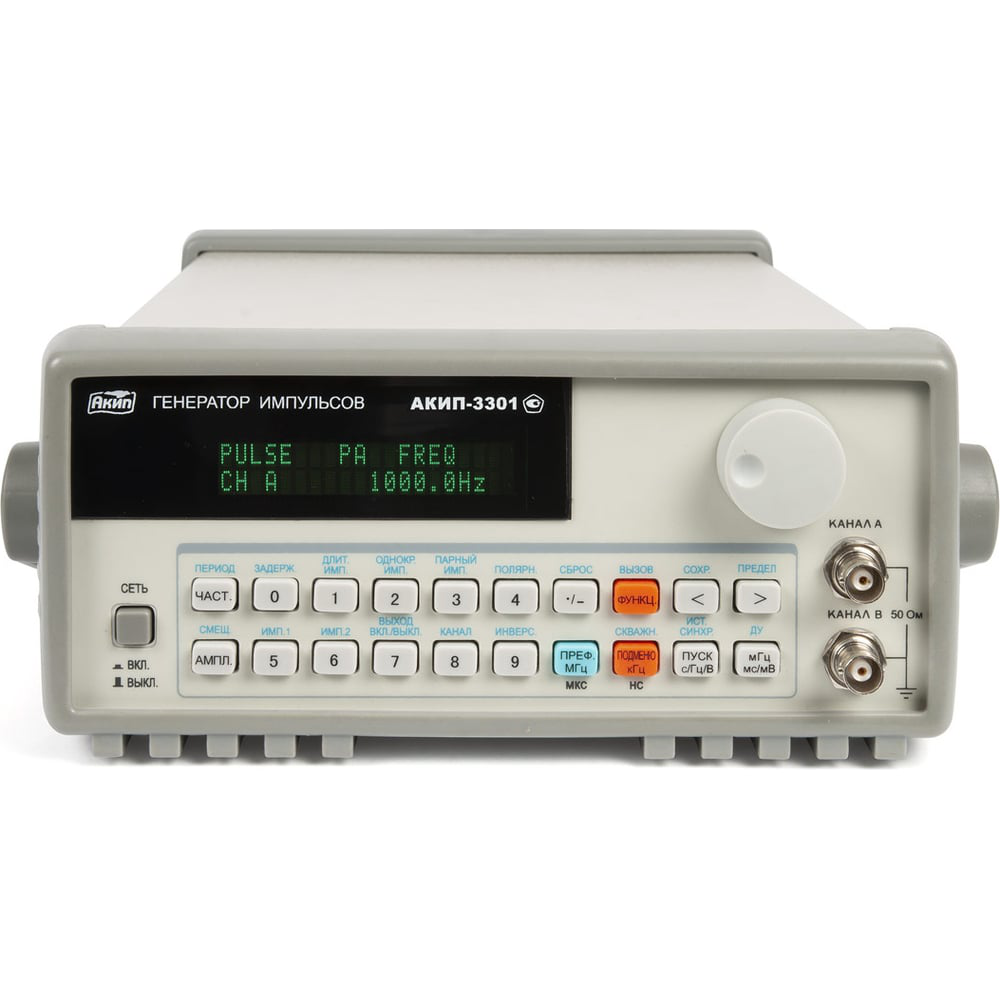 Генератор импульсов АКИП-3301 применяется для генерации импульсов прямоугольной формы. Прибор используется для экспериментальных исследований и образовательных приложений, в лабораторном тестировании, электронном моделировании, техническом дизайне, отладке и ремонте РЭА. Принцип действия основан на технологии прямого цифрового синтеза. Частота формируемых импульсов напряжения на выходе генератора синхронизирована с частотой внутреннего или внешнего опорного генератора. Прибор выполнен в виде компактного моноблока, на передней панели которого расположены органы управления и дисплей.