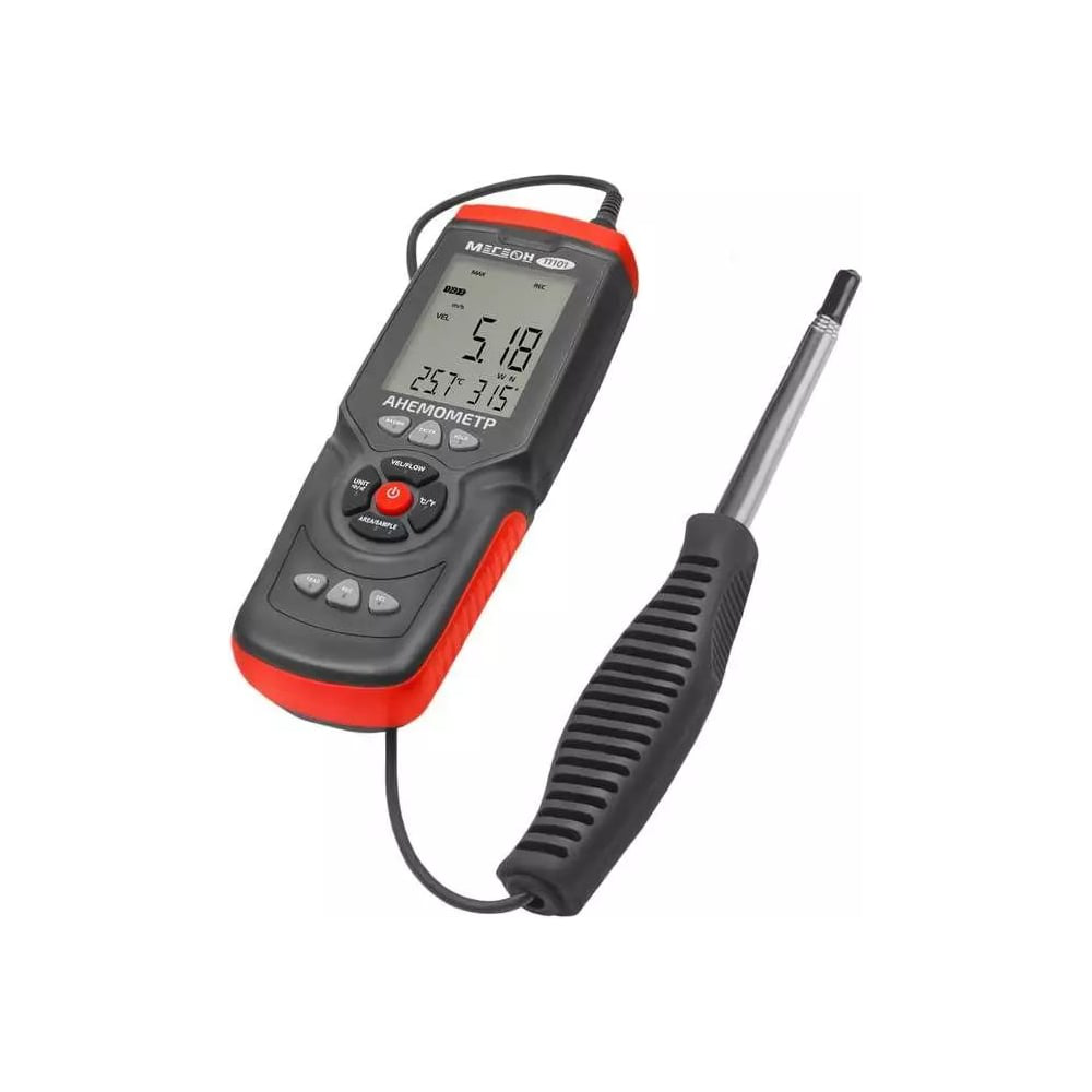 Цифровой анемометр с выносным датчиком типа "нагретая струна" на телескопическом удлинителе. Прибор предназначен для измерения скорости движения и температуры воздушного потока, тем самым сможет собой заменить несколько измерителей. Поможет рассчитать объёмный расход воздуха. Кроме этого с лёгкостью позволит вычислить минимальную, максимальную и среднюю скорость воздушного потока, также предусмотрена функция записи данных в память устройства на 960 показаний, а благодаря подключению к ПК, можно посмотреть результаты и провести анализ в специализированной программе. Прибор получил современный дизайн и большой ЖК- дисплей с подсветкой, а эргономичные формы корпуса и рукоятки зонда положительно сказываются на удобстве эксплуатации. В дополнение на задней стенке расположено монтажное отверстие для установки изделия на штатив. Прибор оснащён функцией подсветки экрана, что облегчает работу в условиях недостаточной освещённости. Также анемометр имеет функцию HOLD, которая позволяет зафиксировать текущее показание на экране для последующего просмотра или записи. Подключение анемометра к компьютеру по USB позволяет передавать данные измерений на компьютер для дальнейшего анализа и хранения. Это особенно полезно при проведении длительных исследований или мониторинге параметров воздушных потоков в реальном времени.