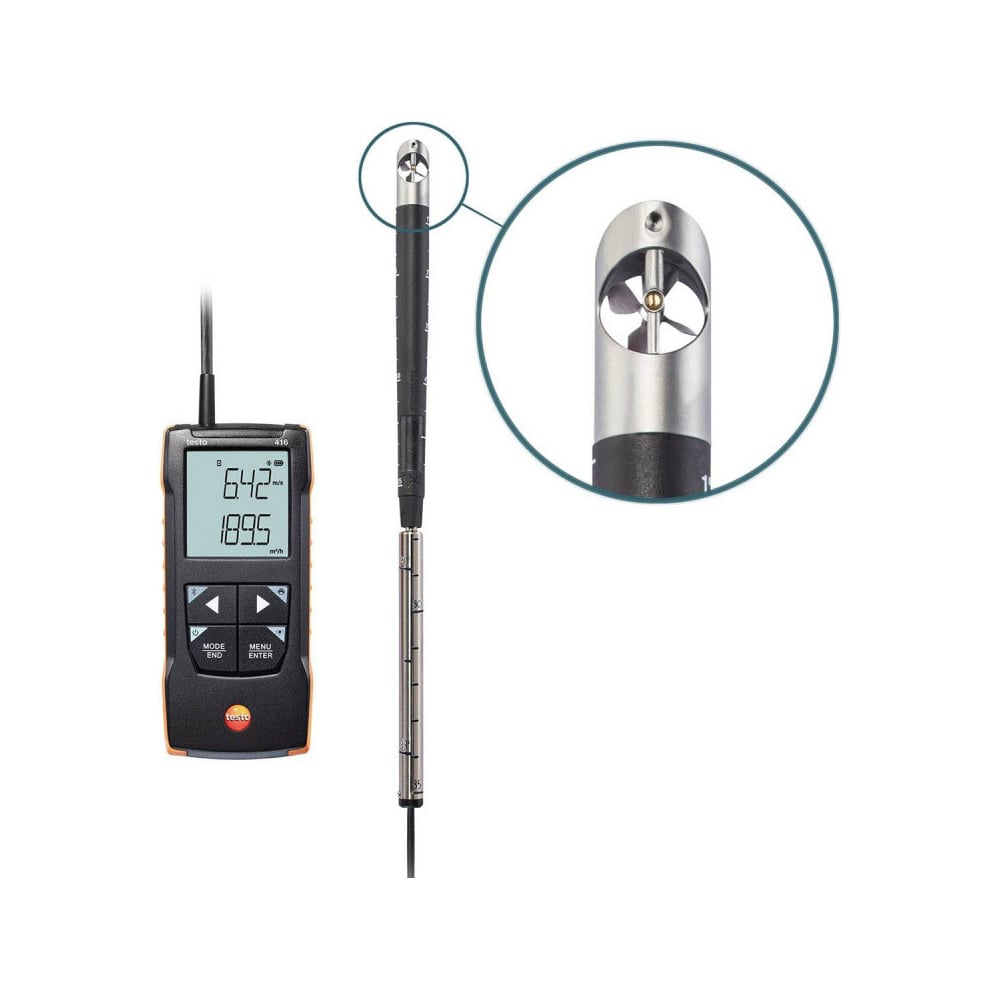 Анемометр Testo 416 – компактный цифровой прибор, снабженный выносным зондом на телескопической рукоятке длиной 850 мм, обеспечивающим выполнение измерений в воздуховодах. В качестве сенсора используется датчик роторного типа диаметром 16 мм, позволяющий контролировать скорость воздушных потоков большей величины, по сравнению с моделью testo 425 – до 40 м/с, с автоматическим расчетом объемного расхода воздуха. От устройства предыдущего поколения с таким же индексом анемометр отличается полностью переработанной конструкцией и поддержкой режима дистанционной передачи данных по Bluetooth на смартфон или беспроводный принтер.