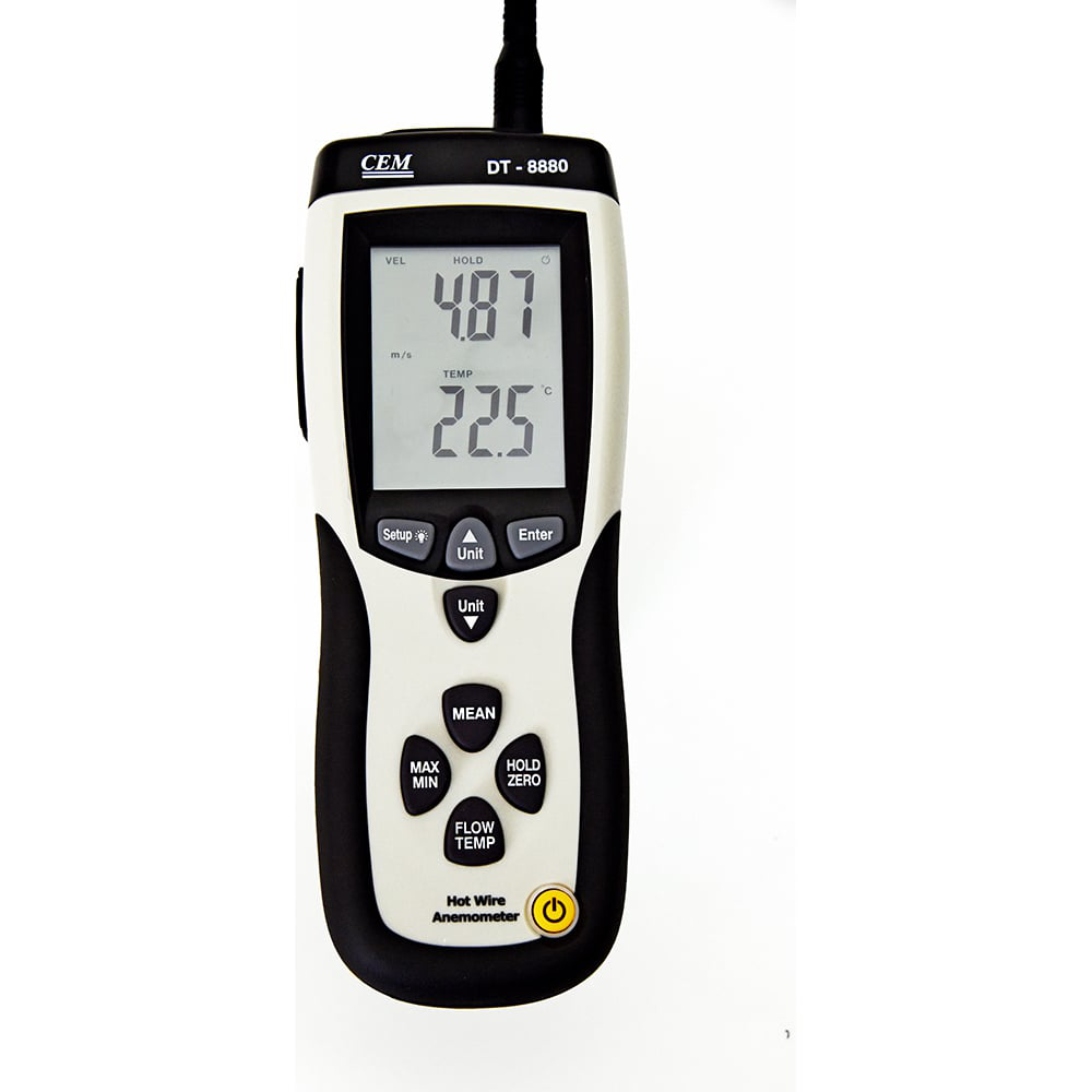 Термоанемометр СЕМ DT-8880 480861 оснащается датчиком диаметром 10 мм. Конструкция предусматривает наличие термосенсора и нагретой струны, что гарантирует высокую точность замеров. Скорость и температура воздушного потока отображаются одновременно для удобства полного анализа окружающей среды и экономии времени оператора. USB-разъем позволяет передавать данные на компьютер.