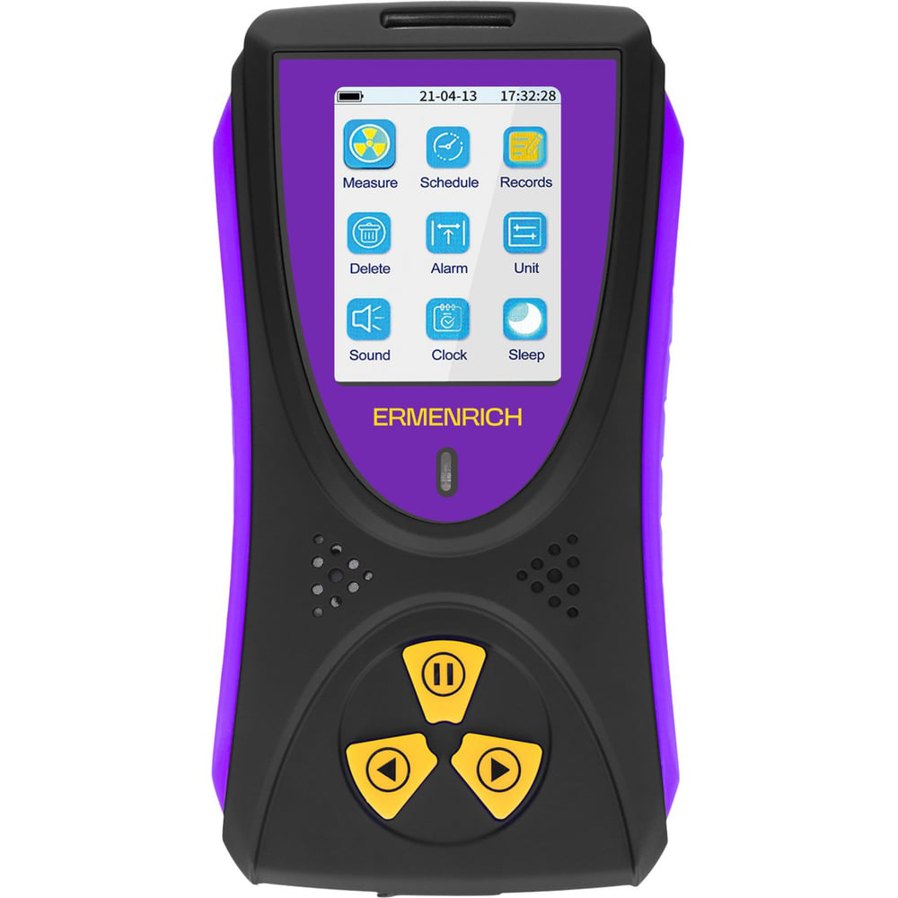 Дозиметр Ermenrich Ping RD50 определяет присутствие и дозу гамма-, бета- и рентгеновского излучения в окружающей среде. Для измерений используется счетчик Гейгера-Мюллера, который позволяет измерять излучение в диапазоне 0,05 мкЗв – 50 мЗв. Результаты замеров выводятся на цветной дисплей, одновременно отображаются текущая, средняя и суммарная доза. В случае превышения допустимых значений прибор подает сигнал светом или звуком. Память дозиметра сохраняет до 10 предыдущих измерений. Компактный эрогономичный корпус защищен от попадания внутрь мелких частиц. Литиевый аккумулятор емкостью 2000 мАч позволяет дозиметру работать до 20 дней без перерывов. Зарядка осуществляется от сети с помощью обычного кабеля USB и адаптера.