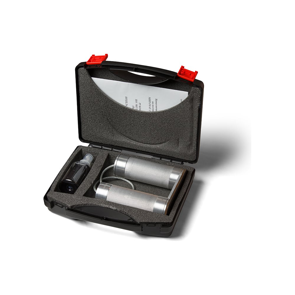 Намагничивающее устройство предназначено для намагничивания участков сварных соединений и поверхностей изделий из ферромагнитных материалов приложенным магнитным полем для обнаружения поверхностных и подповерхностных дефектов (трещины различного происхождения, волосовины, поры, непровары сварных соединений, надрывы) в процессе проведения неразрушающего контроля магнитопорошковым методом. Прибор может применяться для проведения оперативного магнитопорошкового контроля в труднодоступных местах, объектов сложной формы и в случае, когда электрическое питание контролирующего оборудования запрещено по нормативным документам или невозможно, например, при осуществлении высотных работ, в полевых условиях, при контроле качества внутренней поверхности котлов и емкостей. Расстояние между полюсными наконечниками должно быть в пределах от 50 до 200 мм. Технические характеристики: Прибор состоит из двух разнополюсных постоянных магнитов, которые находятся в цилиндрических корпусах, соединенных между собой гибким магнитопроводом (тросом).