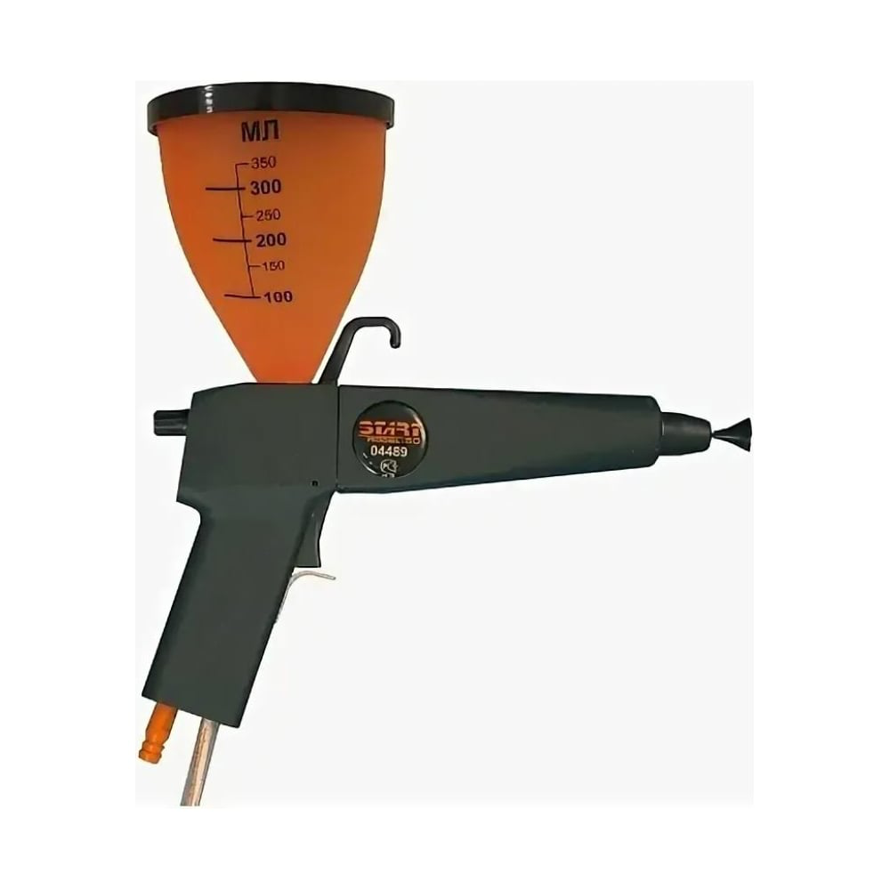 Распылитель с воронкой 400мл START 50 Старт-50 4687202091362 предназначен для мелко и среднесерийного производства, производства с частой сменой цветов краски, отработки технологических процессов. Может использоваться на производствах с автоматическими линиями для подкрашивания изделий. Воронка изготовлена из нового полупрозрачного материала, для удобства операторов порошковой окраски. На поверхность нанесена риска с отметками от 100 до 350 мл. Увеличенная воронка – это рост производительности и удобство в работе.