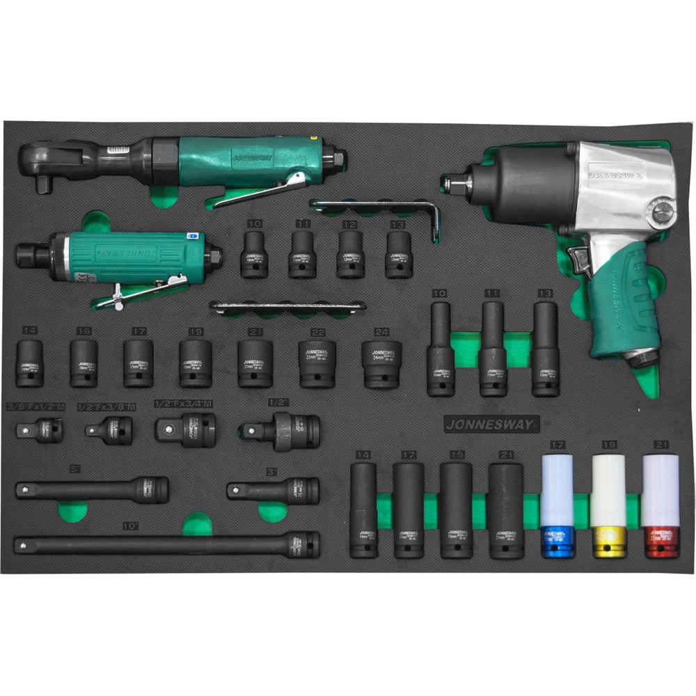 Набор пневматического инструмента Jonnesway JA-C231SV 1/2"DR 31 предмет 49274 пригодится в любом гараже, автосервисе, шиномонтажной мастерской для выполнения различных работ. Включает в себя гайковерт, бормашину, трещотку и набор головок. Все инструменты выполнены из прочных материалов, устойчивых к повреждениям. Обрезиненная рукоятка гайковерта обеспечивает удобный хват. Набор поставляется в удобном ложементе из материала EVA, где каждый элемент находится на своем месте.