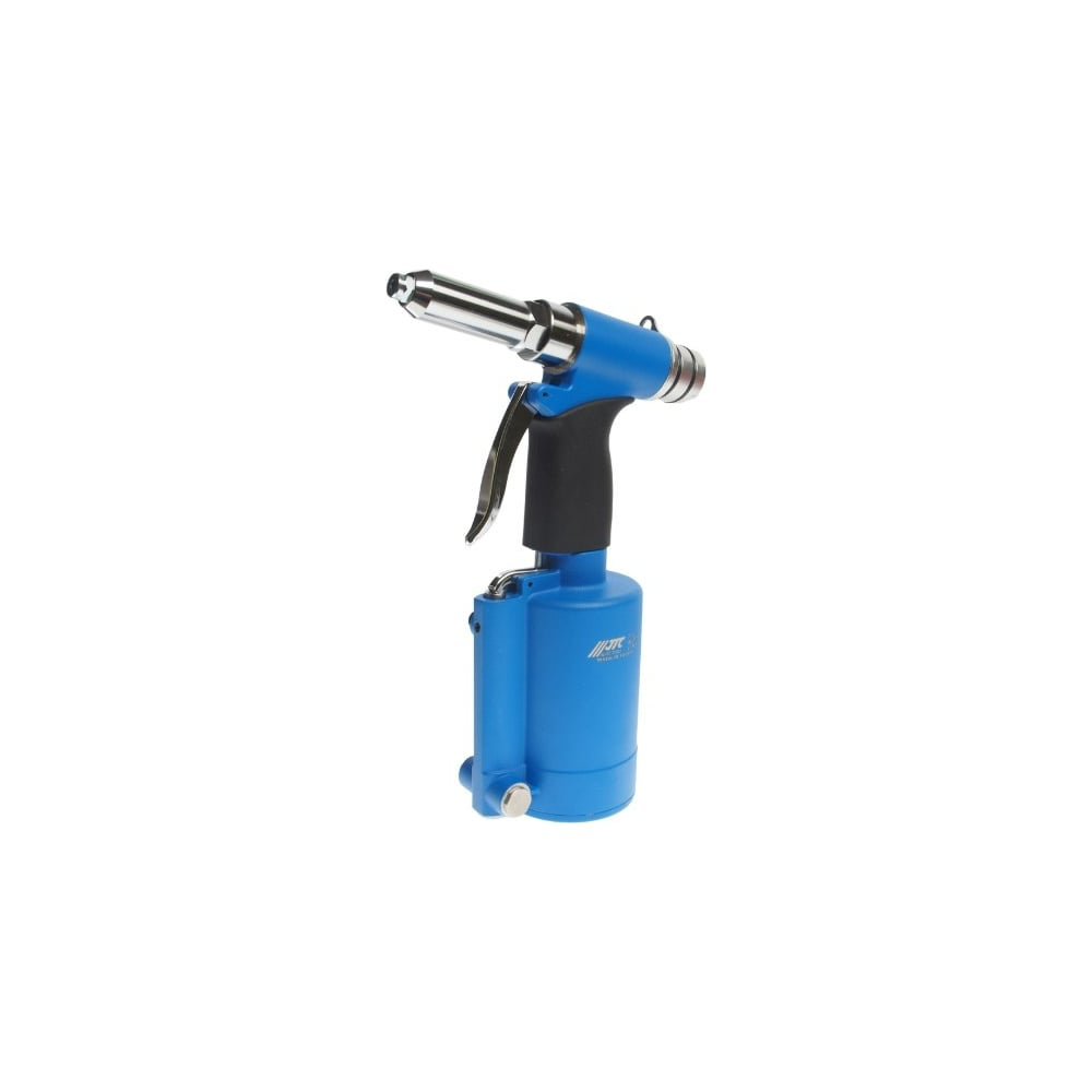 Пневматический заклепочник JTC 7727 применяется для надежного скрепления различных конструкций. В качестве оснастки используются вытяжные алюминиевые заклепки диаметром 4, 4.8, 6, 6.4 мм, стальные (в том числе из нержавеющей стали) заклепки размером 4 и 4.8 мм. Шток - 18 мм. Прочный корпус надежно защищает внутренние элементы от механических повреждений. Конструкция инструмента оснащена гасителем ударов, который снимает усталость рук в процессе работы. Длинную широкую клавишу пуска удобно нажимать при любом хвате рукоятки.