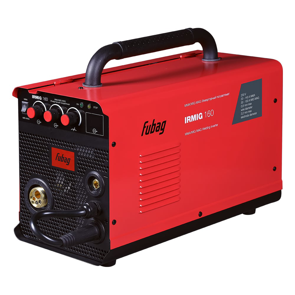 Сварочный инвертор FUBAG IRMIG 160 – высокопроизводительный сварочный полуавтомат, оптимален для проведения сварочных работ на производстве, стройке и в автомастерской. Аппарат позволяет проводить сварку в режимах MIG/MAG и ММА. Сварочный аппарат Fubag IRMIG 160 оснащен евроразъемом для быстрого и безопасного подключения сварочной горелки, а также металлическим подающим механизмом. Горелка 150А - в комплекте. Благодаря плавной регулировке сварочного тока, скорости подачи проволоки и функции регулировки индуктивности, полуавтомат позволяет установить режим сварки для конкретной толщины и материала свариваемых заготовок. Сварочный инвертор IRMIG 160 работает в диапазоне тока 40-160А в режиме MIG/MAG омедненной проволокой диаметром 0,6-0,8/0,8-1,0 мм с катушкой весом 5 кг и диаметром 200 мм, а также флюсовой проволокой с катушкой100 мм весом 1 кг. Универсальный держатель проволоки позволяет надежно крепить обе катушки внутри аппарата. Купив сварочный инвертор IRMIG 160, Вы получите в комплекте трехметровую фирменную горелку FB 150 и трехметровый газовый шланг, а также кабель с электрододержателем (1,6 м) и кабель заземления (3 м). Все технические характеристики наглядно и подробно указаны на корпусе аппарата. Сварочный полуавтомат Fubag IRMIG 160 поставляется с полным набором аксессуаров для MIG/MAG и ММА сварки.