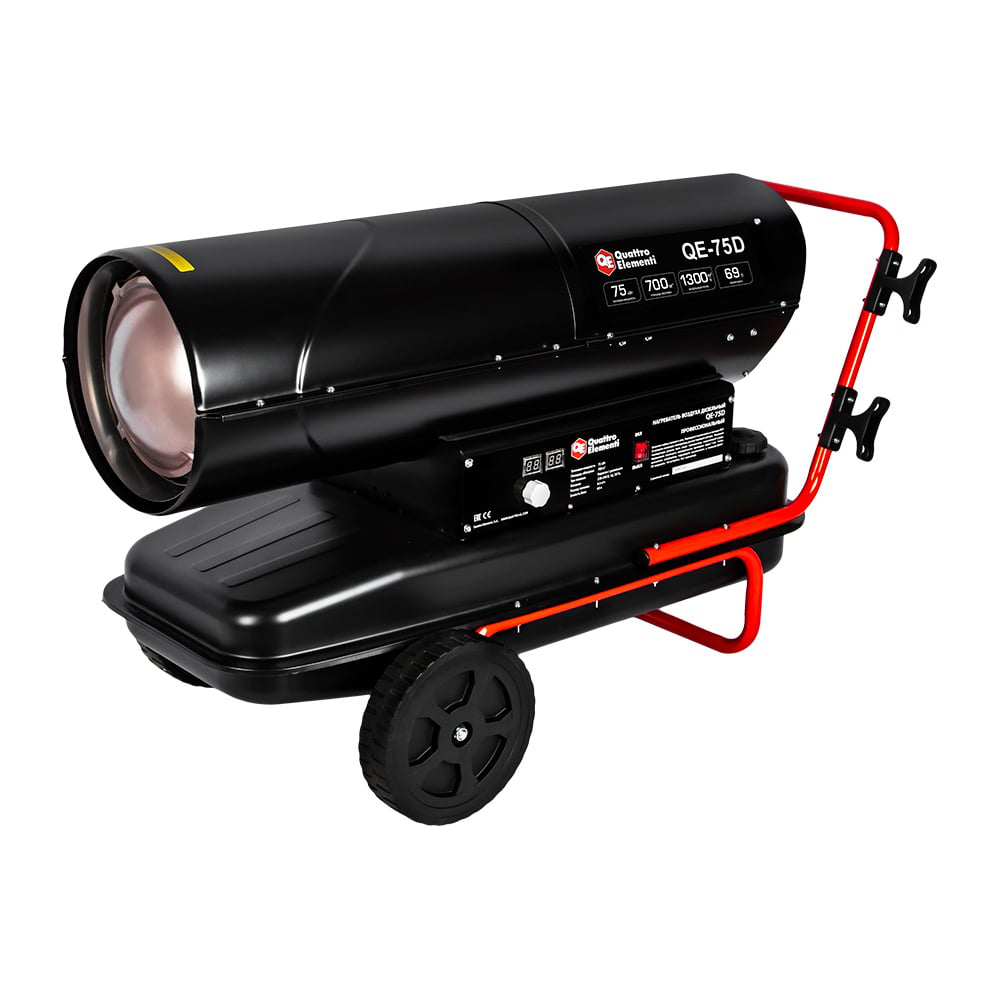 Дизельная тепловая пушка прямого нагрева QE- 75D предназначена для обогрева хорошо вентилируемых нежилых помещений складского и промышленного назначения, ангаров, гаражей и ремонтных зон площадью до 700 м2. Принцип действия основан на прохождении воздушного потока через нагревательный элемент, использующий энергию сгорания дизельного топлива.
