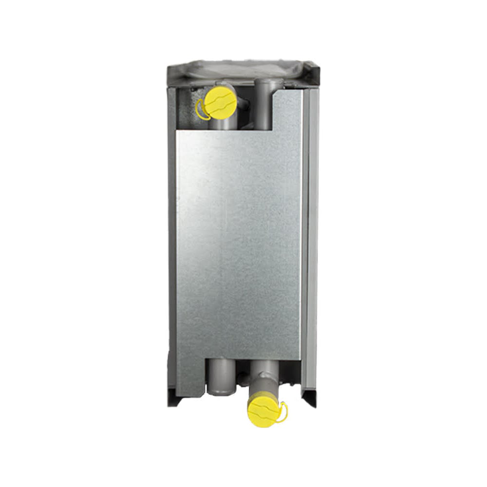 Теплообменник состоит из одного или более рядов медных трубок с внешним диаметром 12 мм, оребренных теплообменными элементами в виде гофрированных пластин из алюминиевой фольги толщиной 0,12…0,25 мм. Трубки объединены в группы, концы которых впаяны в коллекторы из стальных или медных труб, через которые осуществляется вход и выход теплоносителя или хладагента. Для соединения с внешней системой на коллекторах имеются специальные патрубки, обеспечивающие сварное, резьбовое или фланцевое соединение. Нагрев или охлаждение воздуха происходит при его прохождении через теплообменник в процессе взаимодействия с медными трубками и алюминиевыми пластинами.