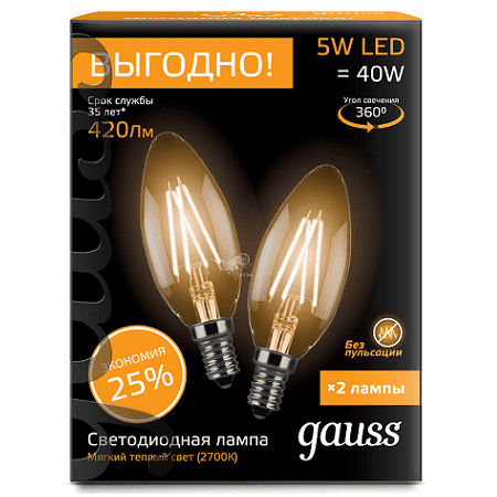 Лампа светодиодная LED 5вт 230в Е14 FILAMENT теплый свеча Gauss ПРОМО (2 лампы в упаковке) Пускорегулирующая аппаратура В комплектеДиаметр, мм 35 Мощность, Вт 5 Тип цоколя E14 Напряжение питания 150-265 Наличие стекла Да Наличие блока аварийного питания Нет Цветовая температура 2700 Длина, мм 110 Ширина, мм 80 Диапазон рабочих температур от -25 до +50 Тип лампы LED