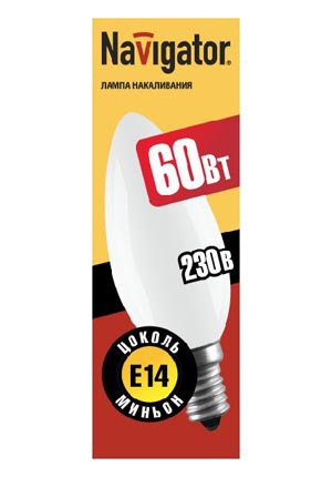 NI-B Navigator NI-B – лампа накаливания общего назначения. Колба лампы прозрачная и матовая, выполнена в форме свечи диаметром 35 мм.Мощность 60 Вт